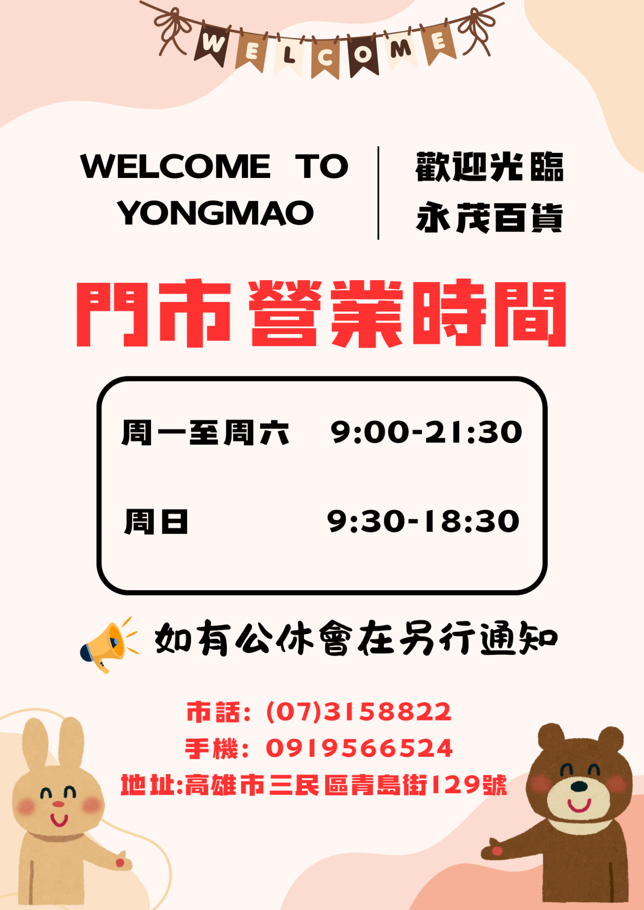 門市營業時間: 周一至周六 9:00-21:30 周日 9:30-18:30 地址: 名稱:永茂醫療用品 地址:高雄市三民區青島街129號1樓 電話: 市話 07-3158822 手機 0919566524