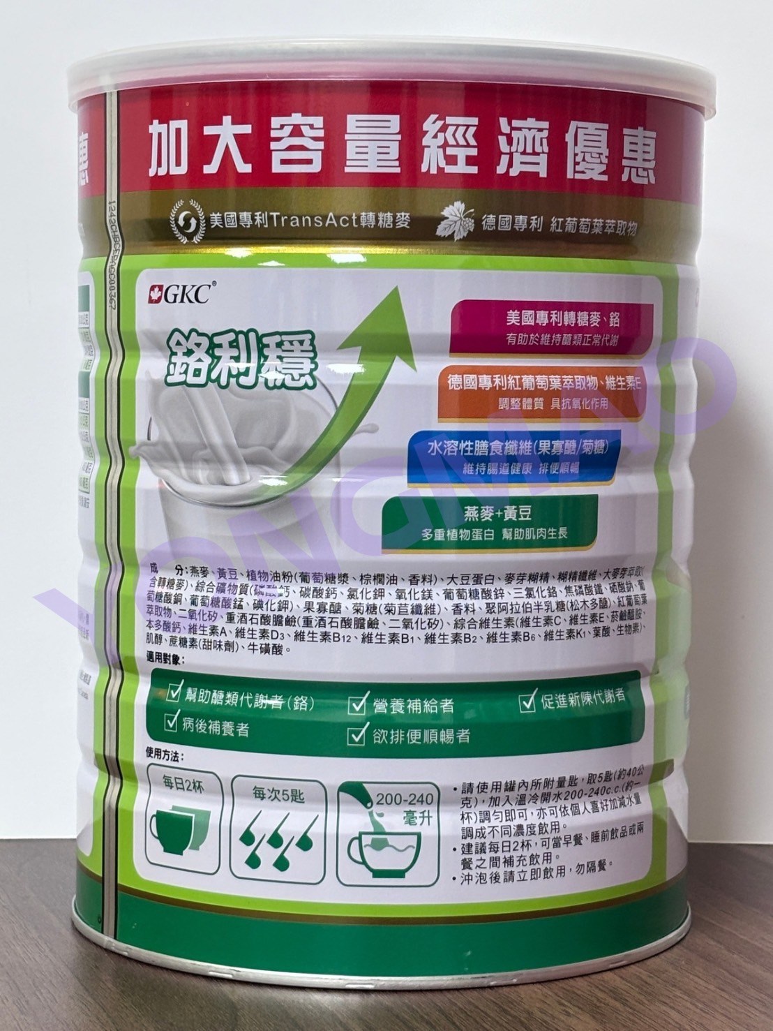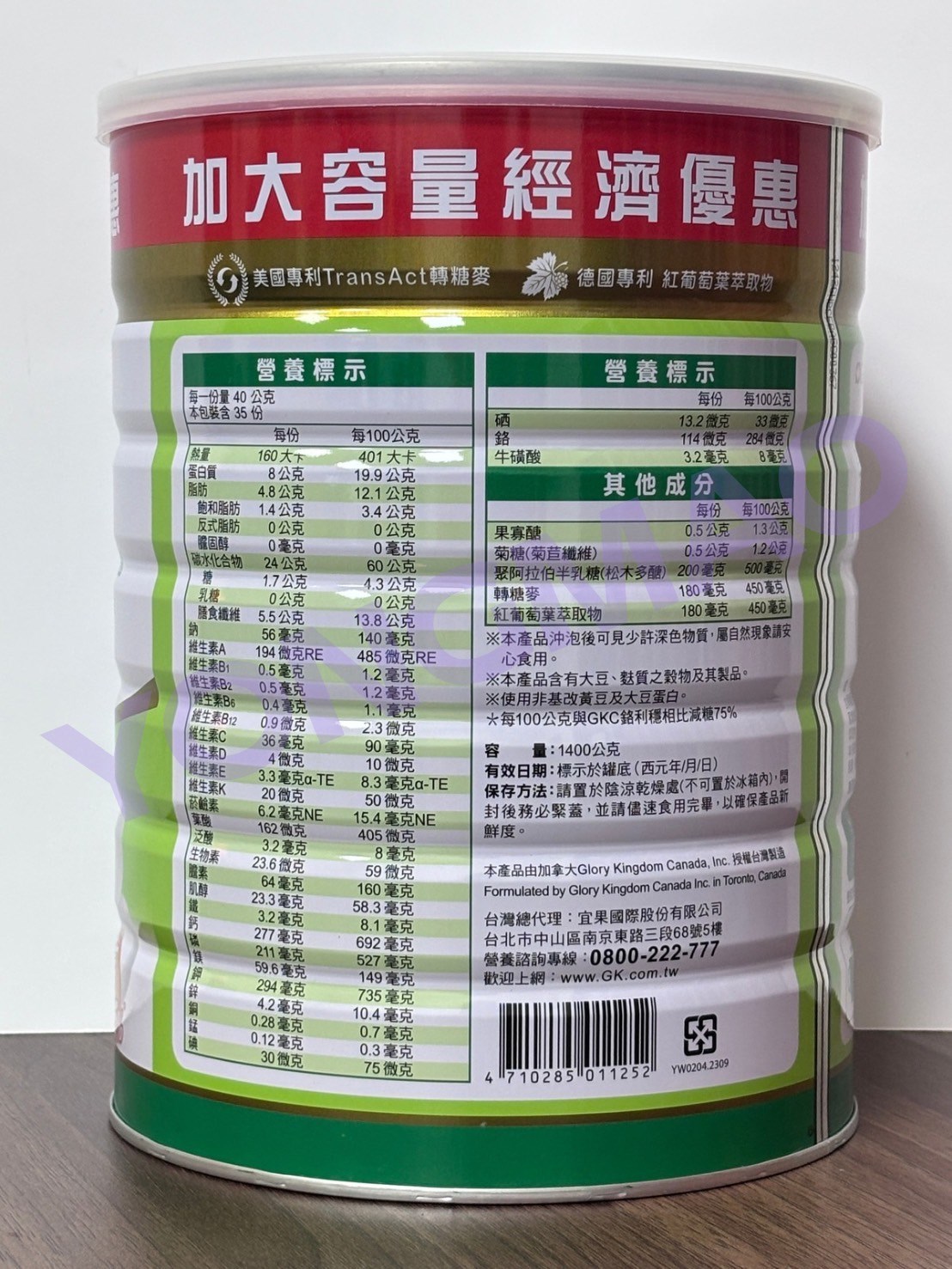 ●高鈣高纖配方 ●美國專利轉糖麥 ●德國專利紅葡萄葉萃取物 ●零膽固醇、零反式脂肪 ●無添加糖