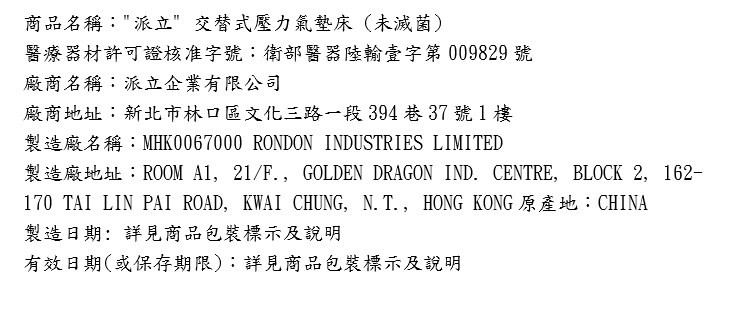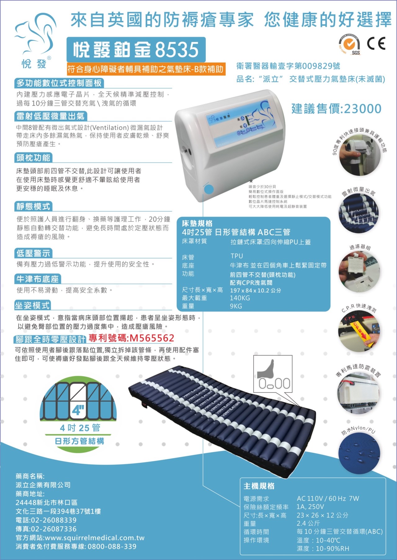 ●多功能數位式控制面板 ●有交替模式及靜態治療模式 ●防潑水、透溼的材質。並通過肌膚敏感性測試 ●可達到預防褥瘡,減壓的效果