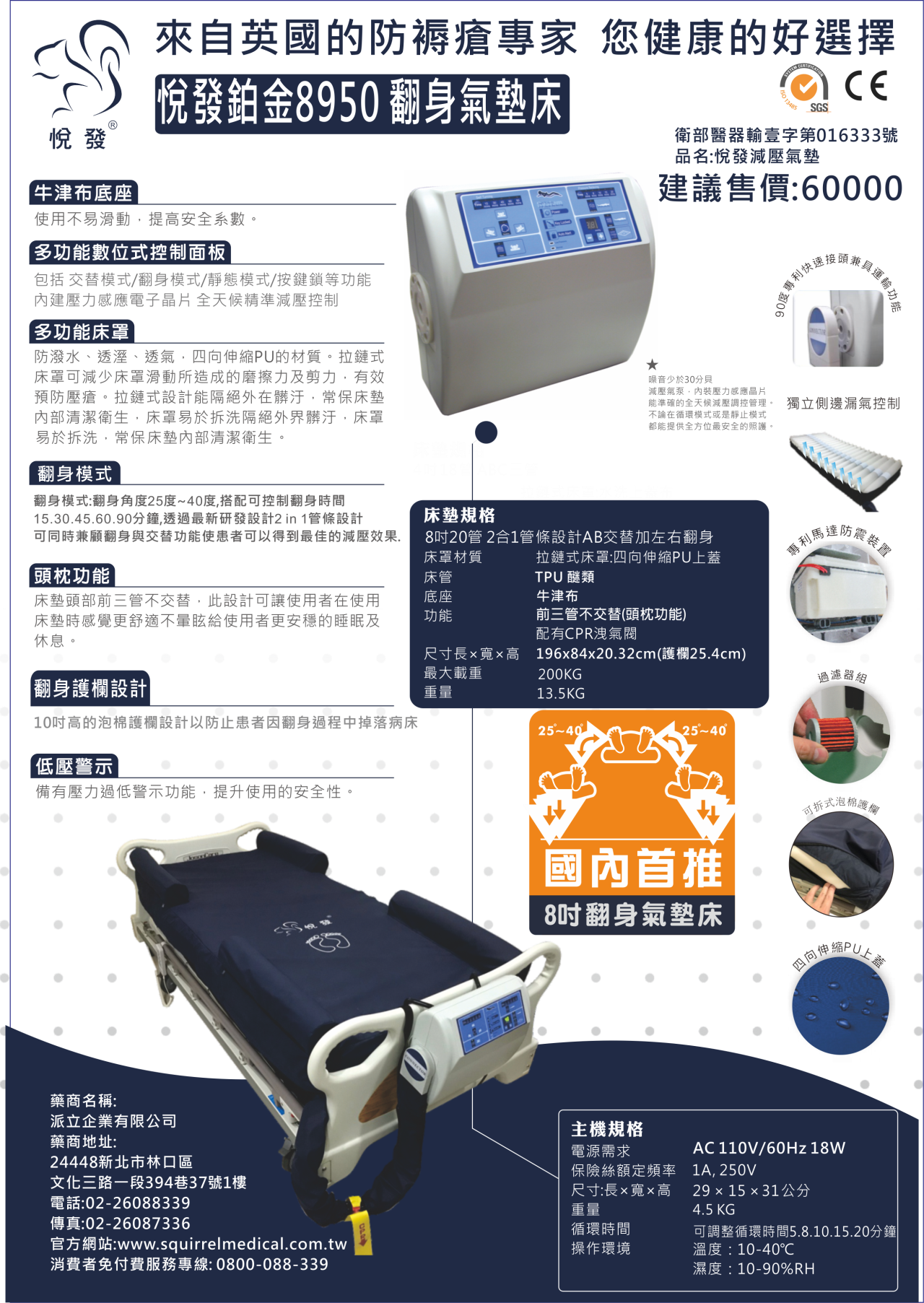 ●多功能數位式控制面板 ●有交替模式及靜態治療模式 ●獨立側邊漏氣控制 ●翻身護欄設計 ●可達到預防褥瘡,減壓的效果