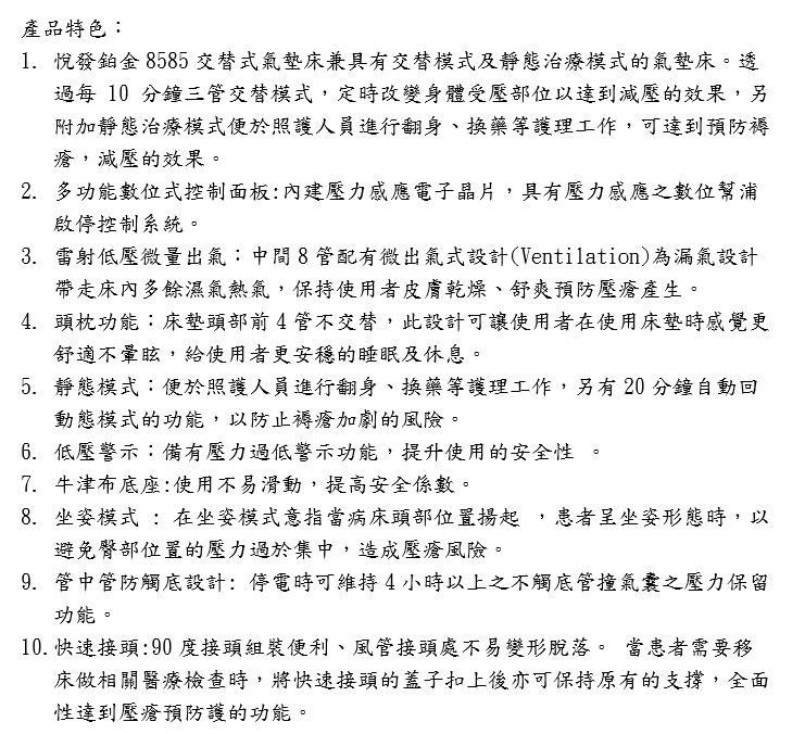 ●多功能數位式控制面板 ●有交替模式及靜態治療模式 ●管中管防觸底設計 ●90度接頭組裝便利、風管接頭處不易變形脫落 ●可達到預防褥瘡,減壓的效果
