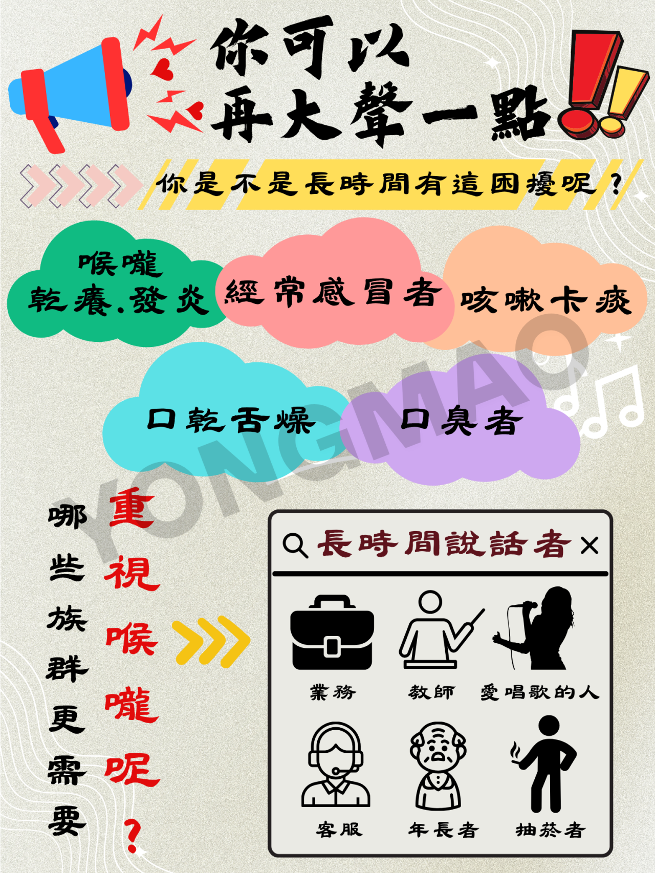 1.職業需要長時間使用喉嚨、聲帶者(如:老師、業務員、主持人、歌手……)
